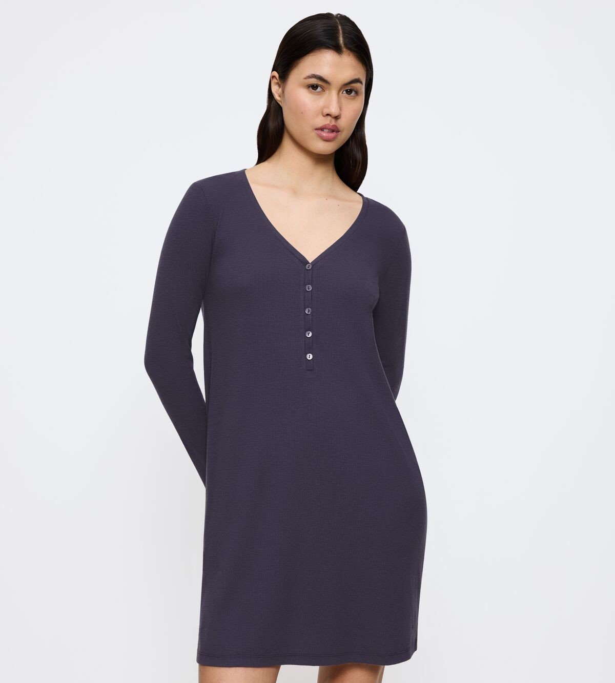 Pikkade varrukatega öösärk. V-kaelus, nööbiliist. Pehme, hingav soonikkoeline trikotaaž.