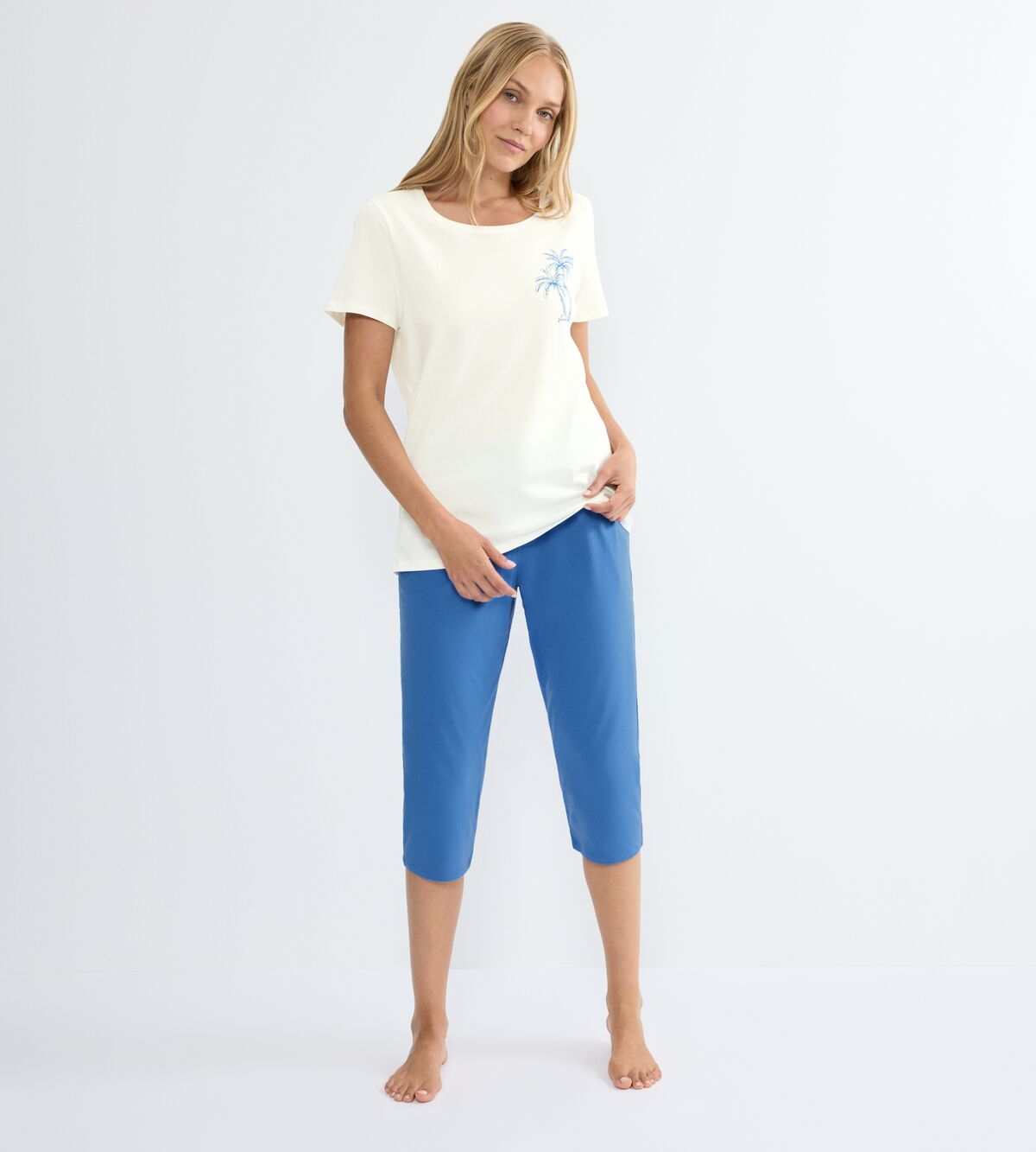Kvaliteetsest puuvillasest trikotaažist pidžaama. Lühikeste varrukatega T-särk. Põlvpükstel on taskud küljeõmblustes.
