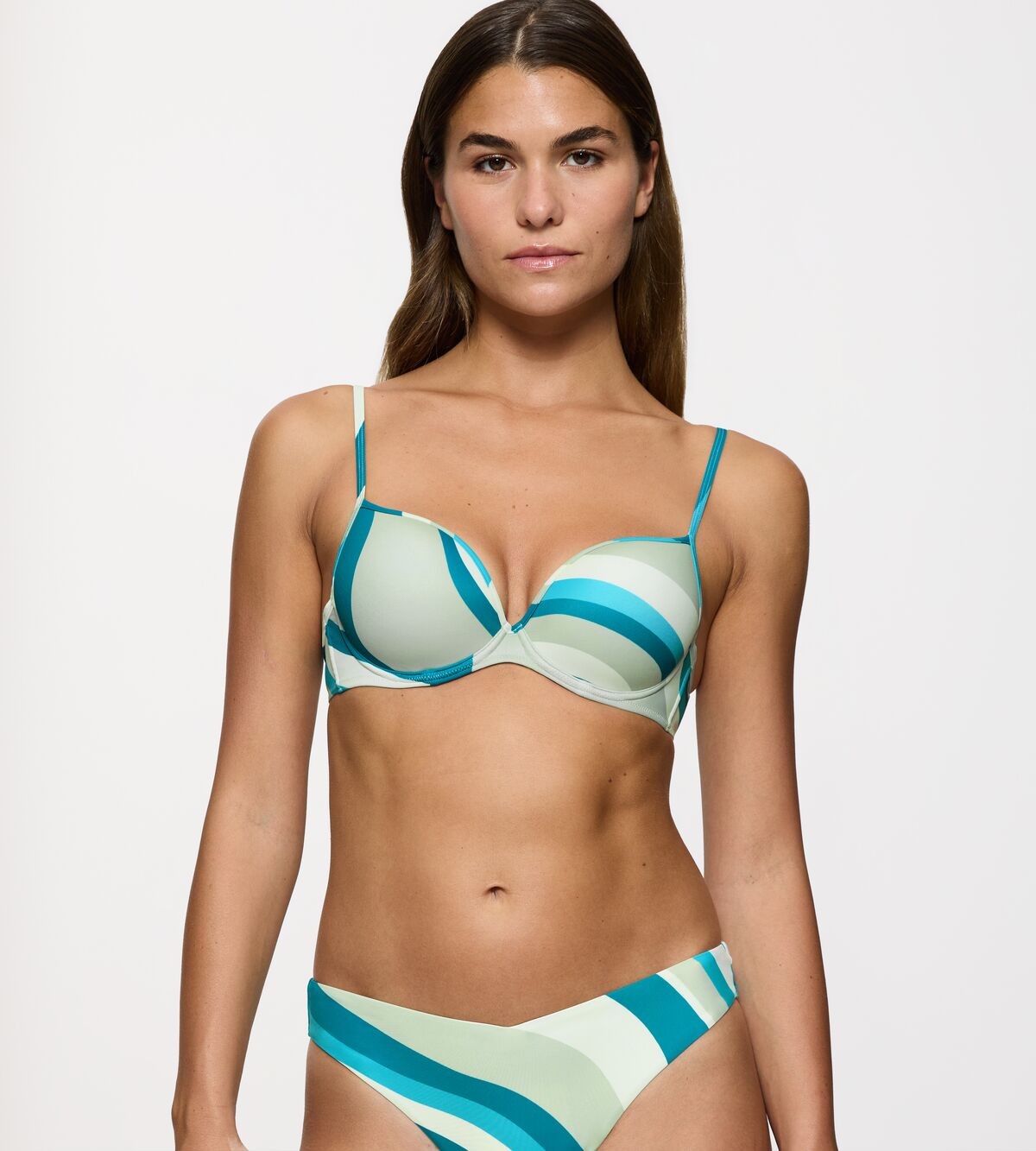 Tugikaartega push-up päevitusrinnahoidja. Reguleeritava pikkusega õlapaelad. Kiirestikuivav polsterdus. Päevitusrinnahoidja materjal on valmistatud taaskasutatud toorainest.