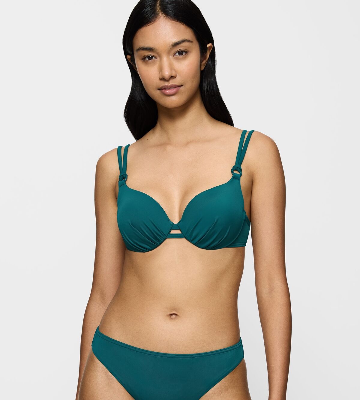 Tugikaartega ja polsterdusega päevitusrinnahoidja. Reguleeritava pikkusega õlapaelu kaunistab metallist rõngas. Päevitusrinnahoidja materjal on valmistatud taaskasutatud toorainest.